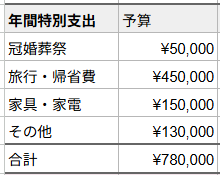冠婚葬祭費を下げるかわりに、旅費・帰省費とその他をUPします。